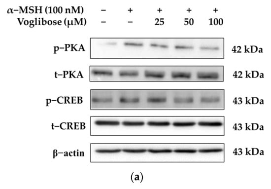 Treatment with α-MSH (100 nM) increased PKA phosphorylation (p-PKA/t-PKA, % of control) by 75.26% compared to the control group, promoting melanogenesis through PKA pathway activation. In contrast, voglibose treatment at concentrations of 25, 50, and 100 μM reduced PKA phosphorylation by 33.49%, 28.43%, and 45.57%, respectively, compared to the α-MSH-treated group. These findings indicate that voglibose can regulate melanogenesis by inhibiting PKA phosphorylation, thereby suppressing the PKA pathway.