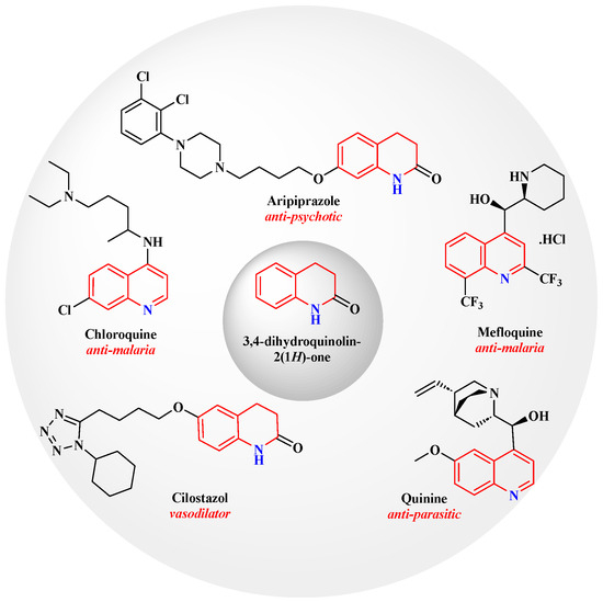 Some FDA-approved quinoline and quinolinone derivative drugs (tetrahydroquinoline core in red color).