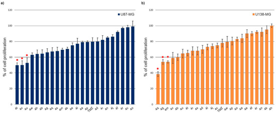 Cell proliferation of glioblastoma cell lines for 48 h of compound treatment: (a) U87-MG and (b) U138-MG. (*) indicates to most active compounds.