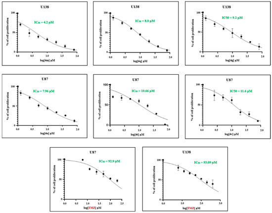IC50 values were calculated depending on the increasing compound concentration (0–160 μM) for both glioblastoma cell lines. The most effective compounds for decreasing cell proliferation were 4u (IC50 = 7.96 μM), 4t (IC50 = 10.66 μM), and 4v (IC50 = 11.66 μM) for U87-MG, and 4m (IC50 = 4.20 μM), 4q (IC50 = 8.00 μM), and 4g (IC50 = 9.20 μM) for the U138-MG cell line (Figure 3). The decrease in cell proliferation was detected with the increase of the compound concentration.
