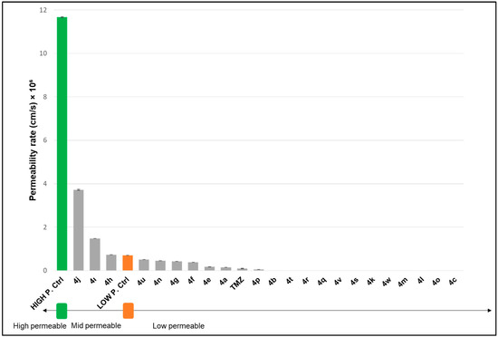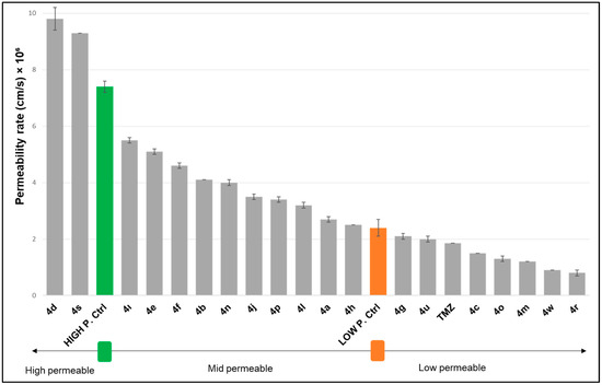 Permeability rates of compounds through the blood brain barrier (BBB)-mimicking membrane (HIGH P. Ctrl: high permeability control, LOW P. Ctrl: low permeability control, TMZ: temozolomide).