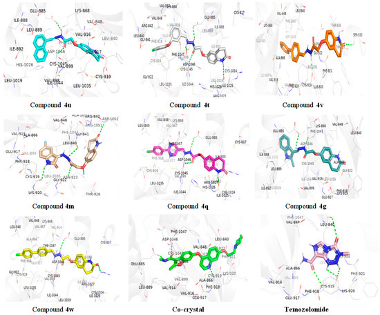 Molecular docking analysis of predicted drugs targeting VEGFR2. Putative binding modes of the best compounds 4u, 4t, 4v, 4m, 4q, 4g, 4w, and temozolomide against VEGFR2 with the co-crystal PF-00337210 (N,2-dimethyl-6-(7-(2-morpholinoethoxy)quinolin-4-yloxy)benzofuran-3-carboxamide) as control. VEGFR2 is represented in a gray lines representation and hydrogen bonding residues highlighted by green dotted lines.