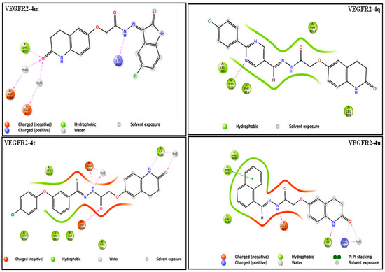 Diagram illustrating interactions between ligand atoms and protein residues of VEGFR2 complexed with the compounds 4m, 4q, 4t, and 4u.