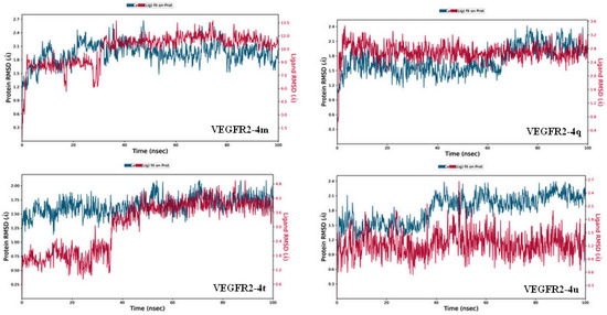 To investigate the dynamic behaviour and stability of VEGFR2–3,4-dihydroquinolin-2(1H)-one derivative complexes, molecular dynamics (MD) simulations were conducted over a 100 ns period. This study focused on evaluating the structural changes induced by the best compounds with a good docking score and number of H-bond interactions, with insight into 4m, 4q, 4t, and 4u. The stability of each protein–ligand complex was monitored through RMSD analysis throughout the simulation. Figure 8 illustrates the RMSD values: the left Y-axis represents the RMSD of the protein, while the right Y-axis shows the ligand RMSD profile aligned with the protein backbone. Frames from the 100 ns trajectory were aligned with a reference frame to assess stability. The RMSD plot reveals that the VEGFR2–4m complex achieved stability after 20 ns, the VEGFR2–4q complex stabilised after 5 ns, although a minor increase in ligand RMSD was noted at 65 ns, the VEGFR2–4t complex became stable after 15 ns, and the VEGFR2–4u complex reached stability after 2 ns, with a slight rise in ligand RMSD observed at 40 ns. Such deviations could be linked to the high number ofthe ligand’s rotatable bonds.