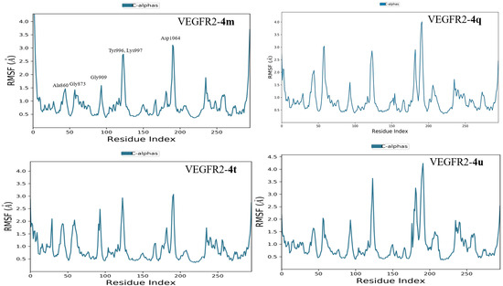 Residue-level fluctuations of VEGFR2 complexed with the compounds 4m, 4q, 4t, and 4u.