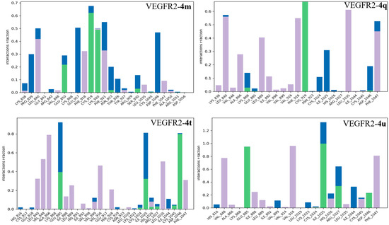 Protein–ligand interaction dynamics throughout the simulation period of VEGFR2 complexed with the compounds 4m, 4q, 4t, and 4u. Hydrogen bonds, hydrophobic contacts, ionic interactions, and water bridges are colored green, purple, pink, and blue, respectively.