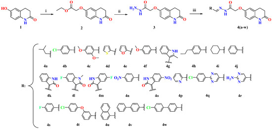 Synthesis of 2-((2-oxo-1,2,3,4-tetrahydroquinolin-6-yl)oxy)acetohydrazide-hydrazone analogues 4(a–w). Reagents and conditions: (i) K2CO3, THF, DMF, and ethyl 2-bromoacetate; (ii) hydrazine hydrate and EtOH, at reflux; (iii) corresponding aldehydes or ketones in EtOH and acetic acid.