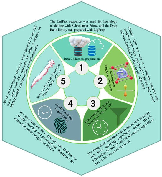 The workflow of the complete study including the data collection, homology modelling, validation, docking, fingerprinting, and MD simulation for reporting the antimalarial compounds.