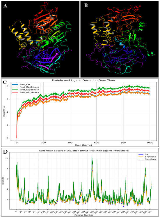 The modelled 3D structures of the protein (A) before the molecular dynamics simulation and (B) after the 50 ns molecular dynamics simulation. The graphs show the MD simulation results, where (C) shows the root-mean-square deviation (RMSD) and (D) shows the root-mean-square fluctuation (RMSF) of the PFSEA during 50 ns molecular dynamics simulations.