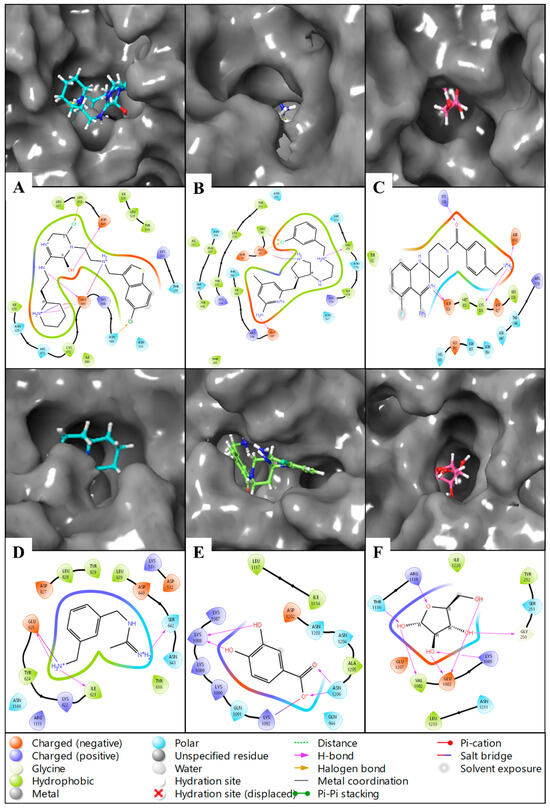 A 3D and 2D ligand interaction diagram of PfSEA-1 with (A) Chlobenethyzenol, (B) Ametchomine, (C) Amiflupipquamine, (D) Ambenzyne, (E) Dihycid, and (F) Alparabinos. The legend shows the residue and interaction types.