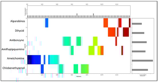 Molecular interaction fingerprints. The main plot is coloured to show the N to C terminal of the protein, the left plot shows the count of ligand interactions, and the upper plot shows the count of interacting residues.