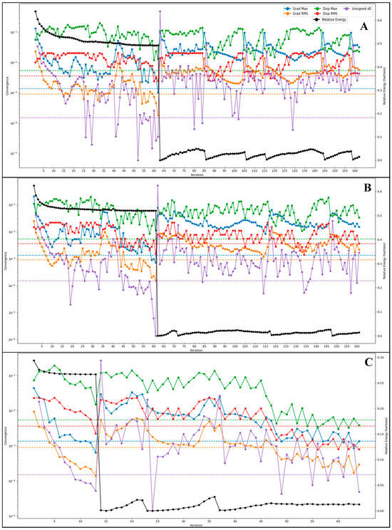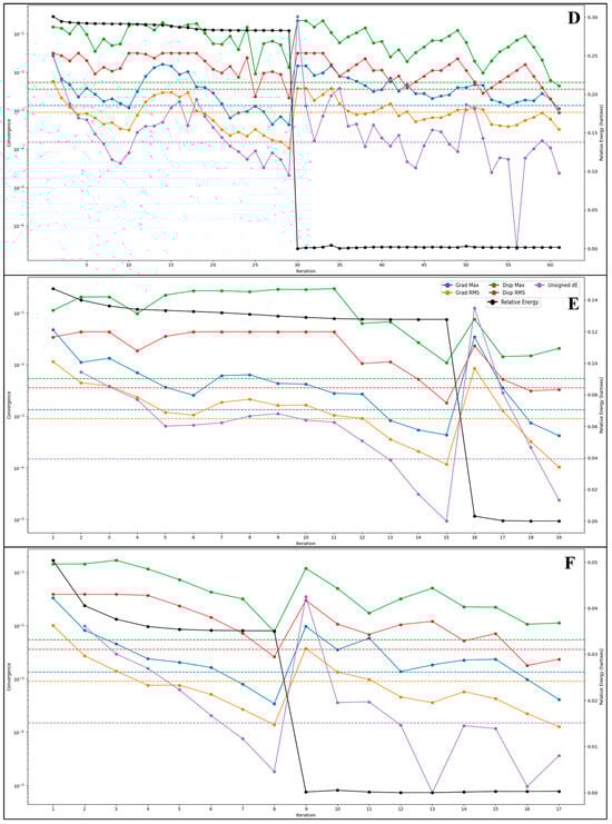 The Jaguar Optimisation tool shows the optimisation results of (A) Alparabinos, (B) Dihycid, (C) Ambenzyne, (D) Amiflupipquamine, (E) Ametchomine, and (F) Chlobenethyzenol where black shows the relative energy converging in each case to show that the ligands are stable.
