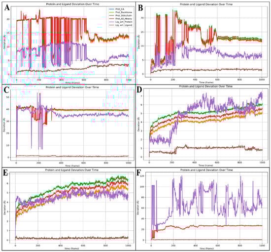 The root-mean-square deviation (RMSD) of PfSEA-1 and (A) Chlobenethyzenol, (B) Ametchomine, (C) Amiflupipquamine, (D) Ambenzyne, (E) Dihycid, and (F) Alparabinos during 100 ns molecular dynamics simulation in the TIP3P water model.