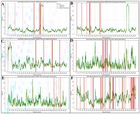 Root-mean-square fluctuation (RMSF) measures the average deviation of each atom or residue from its mean position throughout an MD simulation. RMSF provides insights into the flexibility and dynamic behaviour of different molecule parts. High RMSF values indicate regions with greater flexibility, while low values suggest more rigid, stable regions. This metric is essential for understanding the dynamic properties of protein–ligand complexes and identifying potential binding sites. The complex of PfSEA-1 and Chlobenethyzenol has shown some residues fluctuating, and the top fluctuated residues are ASP827, CYS826, LEU828, MET825, ASP824, GLU822, ASN823, TYR829, LEU821, ASN830, LEU831, LEU820, GLY815, HIS837, GLU819, ILE816, LYS832, TYR817, ASP818, MET833, ASP835, LEU836, and HIS834, and at the same time, many residues have interacted to make the complex stable, these being HIS837, CYS681, HIS682, MET677, ILE676, ASN675, HIS673, CYS672, GLU669, LYS668, ASP117, ASN666, ASP665, LEU638, LEU637, LEU641, ASN664, ASP640, LEU639, SER642, ILE528, ASN643, LYS233, GLU644, LEU529, TYR530, and LYS531 (Figure 7A). The complex of PfSEA-1 and Ametchomine has shown some residues fluctuating, and the top fluctuated residues are GLU1159, PRO1157, ILE1158, TYR1160, GLY1156, LYS1161, LYS1162, ILE1163, ILE1155, TYR1164, ILE1154, LEU1165, HIS1153, LYS1166, PRO1152, SER1151, ASN1167, ASP1149, and LEU1168, and at the same time, many residues have interacted to make the complex stable, these being ALA144, GLU335, ASN145, ASN147, GLN332, TYR331, ASP381, LEU94, ASN130, ASP148, THR382, GLU93, GLU152, LEU328, SER385, ILE383, ARG386, LYS182, ASN396, LYS179, SER399, ASN176, HIS173, TYR400, LEU175, GLU387, PHE397, ILE178, and PHE246 (Figure 7B). The complex of PfSEA-1 and Amiflupipquamine has shown some residues fluctuating, and the top fluctuated residues are ASN25, GLY26, GLU24, GLU27, ILE23, ILE22, GLU28, GLU21, ASN20, LYS29, GLU36, ASP37, ILE19, TYR30, ASP35, VAL31, and ASN18, and at the same time, many residues have interacted to make the complex stable, these being GLU819, LEU516, GLU822, ASN823, TYR632, ASP824, HIS891, CYS826, ASN830, ASN893, MET825, VAL631, GLU892, ASP827, ASN894, ILE629, LEU828, TYR829, ASN630, LYS628, ILE895, ARG1066, THR1068, ASP1190, SER1170, ASN898, LEU1168, ASN1069, ASN1067, ARG1070, ASN1167 (Figure 7C). The complex of PfSEA-1 and Ambenzyne has shown some residues fluctuating, and the top fluctuated residues are THR340, LYS339, LEU1228, ASP1149, ILE1220, GLY341, ASN1227, HIS1229, VAL1221, LYS1218, and ARG338, and at the same time, many residues have interacted to make the complex stable, these being VAL658, ASN659, ASN664, ASN657, ASN1171, TYR829, ASN643, SER642, LEU641, LYS531, ILE621, LEU828, TYR616, LEU639, ASP640, ASP532, ASP998, ASN1169, TYR1108, GLU625, PHE617, ASP827, ARG1111, and LYS1110 (Figure 7D). The complex of PfSEA-1 and Dihycid has shown some residues fluctuating, and the top fluctuated residues are LEU516, PHE517, ASP81, GLY341, GLU518, HIS682, VAL519, and GLU342, and at the same time, many residues have interacted to make the complex stable, these being ILE1114, ALA1205, MET945, ASP1202, LEU1086, ASN1203, ASN1209, ASN1204, GLU1201, HIS1210, GLN944, ASN1206, LYS1090, SER942, ASN1112, LYS1088, GLN1091, LYS1092, and ASN1167 (Figure 7E). The complex of PfSEA-1 and Alparabinos has shown some residues fluctuating, and the top fluctuated residues are ASP818, GLY815, GLU819, ILE816, and TYR817, and at the same time, many residues have interacted to make the complex stable, these being ASP818, GLY815, GLU819, ILE816, TYR817, ASP37, LEU821, LEU820, and many more residues (Figure 7F).