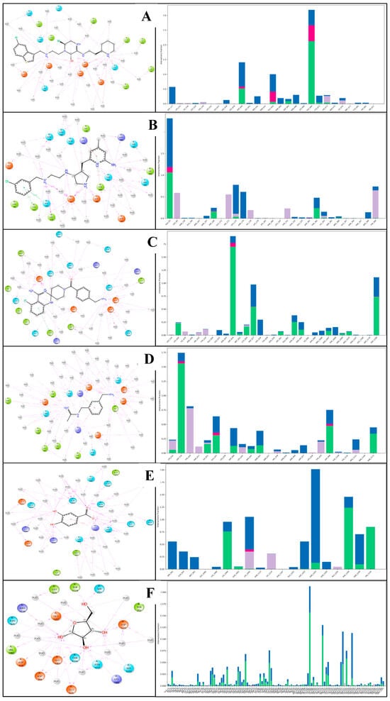 A simulation interaction diagram (SID) and histogram representation of the count of interactions during the simulation among PfSEA-1 and (A) Chlobenethyzenol, (B) Ametchomine, (C) Amiflupipquamine, (D) Ambenzyne, (E) Dihycid, and (F) Alparabinos during 100 ns molecular dynamics simulation in the TIP3P water model.