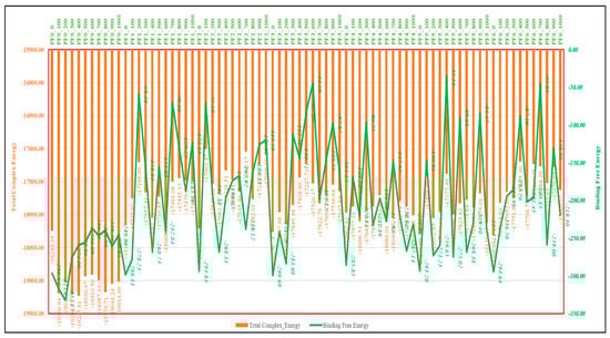 The MM/GBSA (Molecular Mechanics Generalized Born Surface Area) computations’ results, where we have shown the binding free energy in green and the total complex energy in orange for (PF0) PfSEA-1, as well as PfSEA-1 in complex with (PF1) Chlobenethyzenol, (PF2) Ametchomine, (PF3) Amiflupipquamine, (PF4) Ambenzyne, (PF5) Dihycid, and (PF6) Alparabinos.
