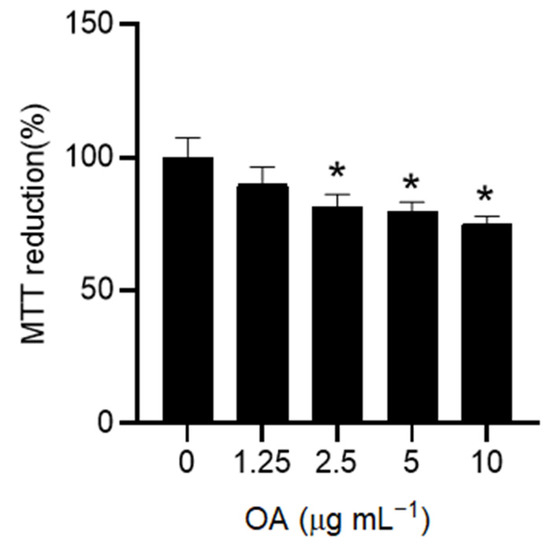 Figure 1. Effect of OA on HaCaT cell viability. HaCaT cells were exposed to increasing doses of OA (0–10 µg mL−1) in a serum-free medium for 24 h. Viable cells were detected as metabolically active cells using the MTT assay. Results are expressed as the mean ± standard deviation (SD) of three independent experiments. Statistical analysis was performed by one-way ANOVA followed by the post hoc Tukey’s HSD test (n = 3). * p < 0.05 compared with untreated control cells (0).