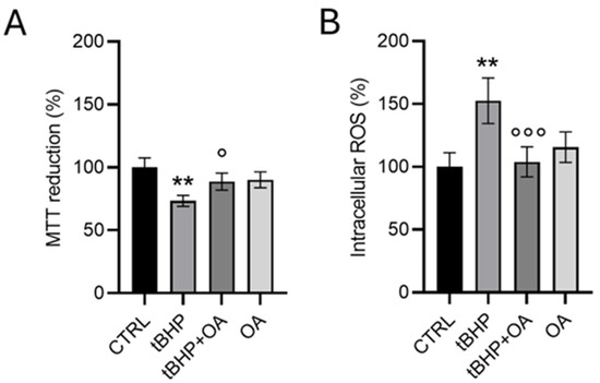 Figure 2. Effect of OA on the viability (A) and intracellular ROS formation (B) in HaCaT cells exposed to the pro-oxidative agent tBHP. HaCaT cells were pre-treated with OA (1.25 µg mL−1) for 2 h and then exposed to tBHP (200 µM) for 3 h in serum-free medium. Untreated cells or those treated with OA or tBHP alone were used as controls. Data are expressed as the mean ± SD of three separate experiments. Statistical analysis was performed using one-way ANOVA followed by Tukey’s HSD test (n = 3): ** p < 0.01 vs. CTRL; ° p < 0.05, °°° p < 0.001 vs. tBHP-treated cells.