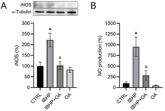 Figure 3. Analysis of iNOS expression by Western blot analysis (A) and NO production and release into the culture medium by the Griess test (B) in HaCaT cells exposed to the pro-oxidant tBHP. HaCaT cells were pre-treated with OA (1.25 µg mL−1) for 2 h and then exposed to tBHP (200 µM) for 3 h in serum-free medium. Untreated cells or cells treated with OA or tBHP alone were used as controls. Data are reported as the mean ± SD of three different experiments. For the Western blot analysis, statistics were performed using the Kruskal–Wallis test followed by Conover’s post hoc test (n = 3): * p < 0.05 vs. CTRL; ° p < 0.05 vs. tBHP-treated cells. For the Griess test, statistics were performed by using one-way ANOVA followed by the post hoc Tukey HSD test (n =3): * p < 0.05 vs. CTRL; ° p < 0.05 vs. tBHP-treated cells.