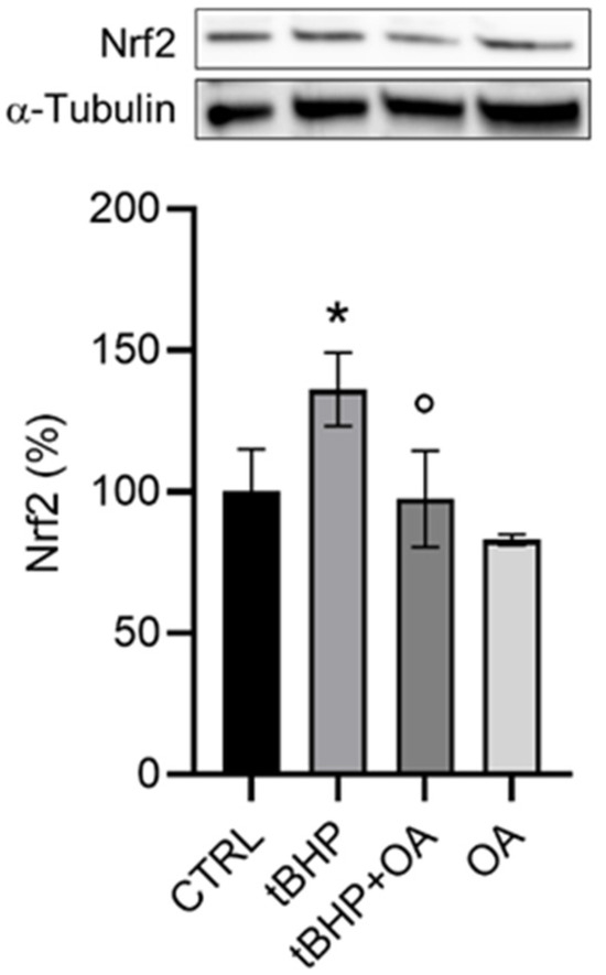 Figure 4. Analysis of Nrf2 expression by Western blot assay in HaCaT cells exposed to the pro-oxidative agent tBHP. HaCaT cells were pre-treated with OA (1.25 µg mL−1) for 2 h and then exposed to tBHP (200 µM) for 3 h in serum-free medium. Untreated cells or cells treated with OA or tBHP alone were used as controls. Data are reported as the mean ± SD of three different experiments. Statistical analysis was performed using the Kruskal–Wallis test followed by Conover’s post hoc test (n = 3): * p < 0.05 vs. CTRL; ° p < 0.05 vs. tBHP-treated cells.