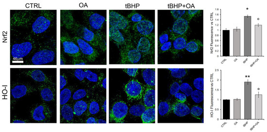 Figure 5. Nrf2 and HO levels in HaCaT cells. Representative confocal images of HaCaT cells pre-treated with OA (1.25 µg mL−1) for 2 h and then exposed to tBHP (200 µM) for 3 h in serum-free medium. Nuclei cells were labelled by HOECHST 33342 (blue fluorescence), and Nrf2 and HO were stained with rabbit anti-Nrf2 or anti-HO primary antibodies followed by treatment with Alexa 488-conjugated anti-rabbit secondary antibodies (green fluorescence). Quantification of the green mean fluorescence intensity signals is reported on the right and was performed by ImageJ Fiji software (Version 1.54m). One-way ANOVA test: * p < 0.05; ** p < 0.01 vs. CTRL; ° p < 0.01 vs tBHP. Values are the average of 5 independent experiments± SE.