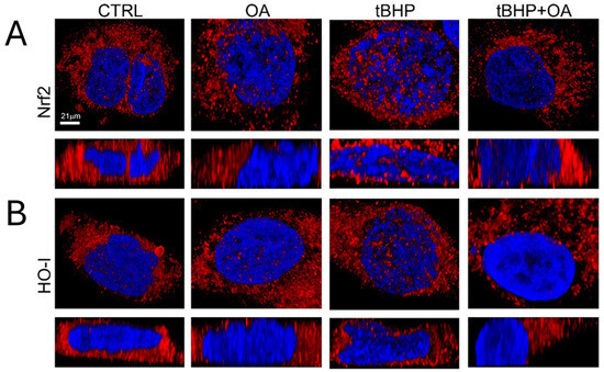 Figure 6. Nrf2 and HO internalization. (A,B) Representative images from super-resolution confocal microscopy (STED). HaCaT cells were pre-treated with OA (1.25 µg mL−1) for 2 h and then exposed to tBHP (200 µM) for 3 h in serum-free medium. Then, HaCaT cells were marked using HOECHST 33342 for nuclei (blue fluorescence), and Nrf2 (A) or HO-1 (B) was visualized with their specific primary antibody and anti-rabbit Alexa 546 secondary antibodies (red fluorescence). Reconstructions of the z-stack analysis of the cells shown in panels were performed by Leica software (Versions 5.1.0).