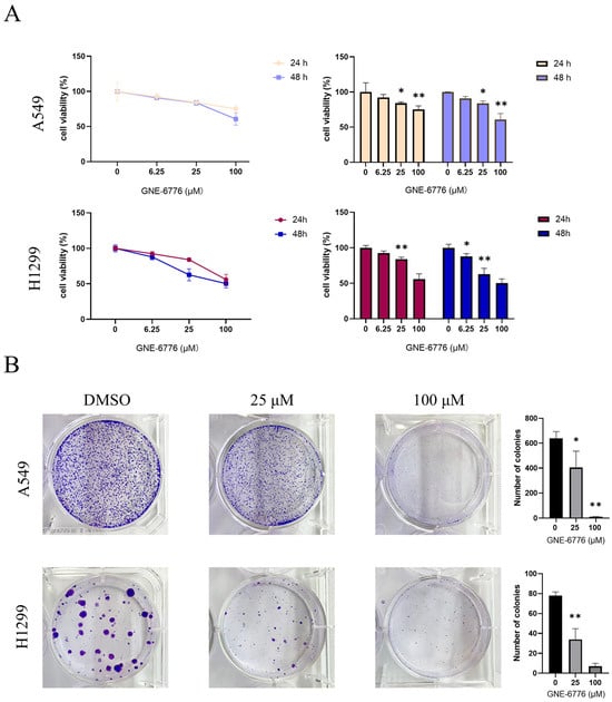 Effect of GNE-6776 on the proliferation of A549 and H1299 cells. Cells were exposed to GNE-6776 at increasing concentrations (0, 6.25, 25, and 100 μM) for 24 or 48 h. The viability of the cells was then determined using a CCK-8 assay (A). Additionally, representative images of A549 and H1299 cell colonies treated with various concentrations of GNE-6776 for 10 days are shown (B) with similar statistical analysis. The results are presented as the mean ± SD (n = 9), and statistical analysis was conducted using one-way ANOVA. * p < 0.05, ** p < 0.01, compared with the control group.