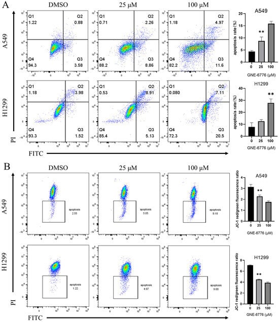 Effect of GNE-6776 on apoptosis of NSCLC cells. Flow cytometry analysis of apoptosis in A549 and H1299 cells treated with varying concentrations of GNE-6776 for 24 h. Cells were stained with (A) annexin V-FITC/PI and (B) JC-1 assay. Quantification of (A) apoptotic rate and (B) red/green fluorescence ratio were also shown. The results are presented as the mean ± SD (n = 9), and statistical analysis was conducted using one-way ANOVA. ** p < 0.01, compared with the control group.