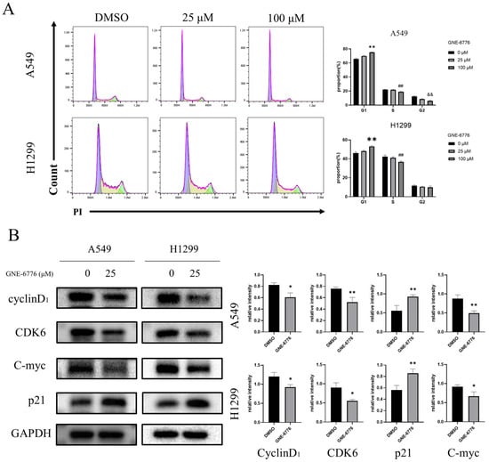 Effect of GNE-6776 on the cell cycle distribution and cell cycle-related protein expression of NSCLC cells. (A) Flow cytometry was used to analyze the cell cycle distribution of A549 and H1299 cells following a 24 h treatment with different concentrations of GNE-6776. The purple section represents the G1 phase, the yellow section represents the S phase, and the green section represents the G2 phase. The results are presented as the mean ± SD (n = 9), and statistical significance was determined using one-way ANOVA. ** indicates p < 0.01 for the G1 phase compared to the control group, ## indicates p < 0.01 for the S phase compared to the control group, and && indicates p < 0.01 for the G2 phase compared to the control group. (B) western blot analysis was performed to assess the expression of key G1 phase proteins (cyclin D1, CDK6, C-myc, and p21) in A549 and H1299 cells treated with 25 μM GNE-6776 for 24 h. GAPDH served as a loading control. The data are presented as the mean ± SD (n = 3), and statistical significance was analyzed using Student’s t-test. * p < 0.05, ** p < 0.01, compared to the control group.