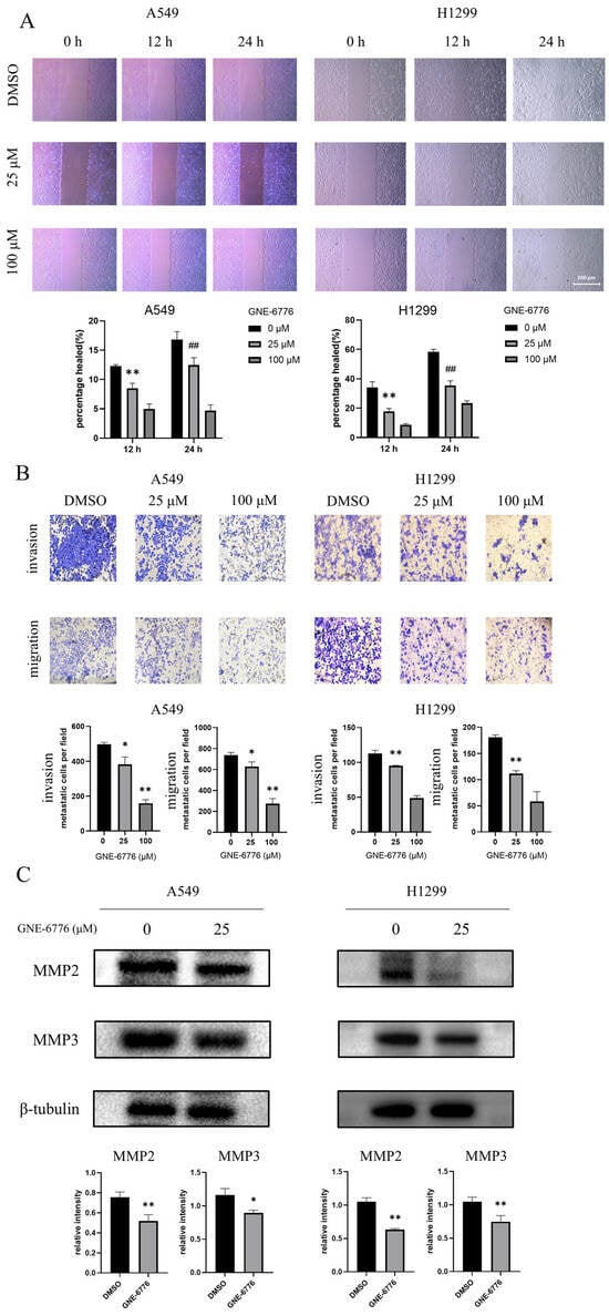 GNE-6776 inhibits the migration and invasion of NSCLC cells and the expression of MMPs. (A) Representative images show the wound healing of A549 and H1299 cells treated with different concentrations of GNE-6776 at 0, 12, and 24 h. Data are mean ± SD (n = 9), and statistical significance was determined by one-way ANOVA. ** represents p < 0.01 compared to the control group at the 12-h time point, ## represents p < 0.01 compared to the control group at the 24-h time point. (B) Representative images depict migrated (lower row) and invaded (upper row) A549 and H1299 cells following treatment with GNE-6776. Data are mean ± SD (n = 9), with statistical significance analyzed by one-way ANOVA. * p < 0.05, ** p < 0.01, compared to the control group. (C) Western blot analysis of MMPs in NSCLC cells treated with 25 μM GNE-6776 for 24 h is shown, with β-tubulin as a loading control. Data are mean ± SD (n = 3), and statistical significance was analyzed by Student’s t-test. * p < 0.05, ** p < 0.01, compared to the control group.