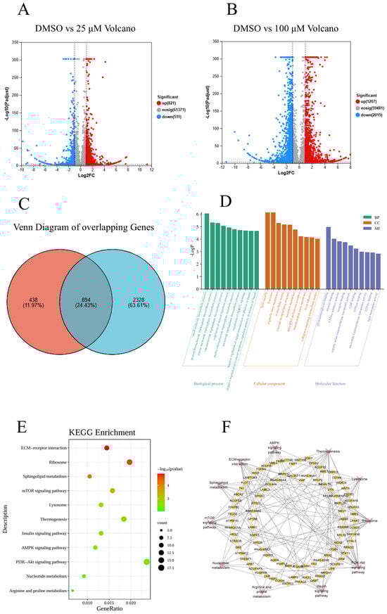 A differential gene expression analysis was conducted by comparing the sequencing results from the control group with the low-concentration and high-concentration groups. The results revealed that there were 1332 DEGs between the low-concentration group and the control group, including 821 upregulated genes and 511 downregulated genes (Figure 5A). Between the high-concentration group and the control group, 3222 DEGs were identified, comprising 1207 upregulated genes and 2015 downregulated genes (Figure 5B), with 894 DEGs that overlapped between the two comparison groups (Figure 5C).