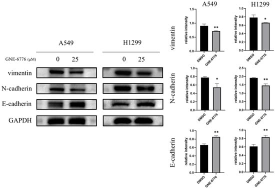 Effects of GNE-6776 on EMT protein expression in NSCLC cells. Western blot analysis revealed the expression levels of EMT markers (E-cadherin, N-cadherin, vimentin) in NSCLC cells after 24 h treatment with 25 μM GNE-6776. GAPDH served as a loading control. Data are mean ± SD (n = 3), and statistical significance was determined using Student’s t-test. * p < 0.05, ** p < 0.01, compared to the control group.