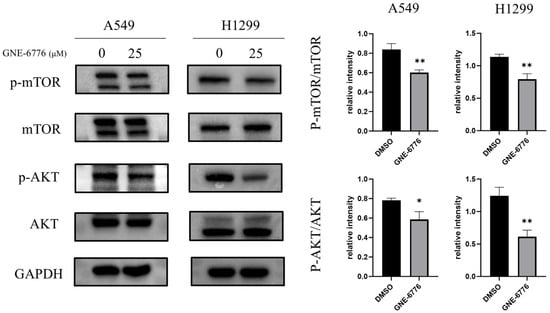 The protein levels of the key proteins p-AKT/AKT and p-mTOR/mTOR in the PI3K/AKT/mTOR pathway were analyzed using Western blot analysis. Both proteins showed significantly decreased levels (Figure 7). Therefore, GNE-6776 affected the proliferation, migration, and invasion of A549 and H1299 cells through the PI3K/AKT/mTOR pathway.