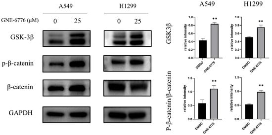 Effects of GNE-6776 on Wnt/β-catenin signaling pathway protein expression in NSCLC cells. NSCLC cells were treated with 25 μM GNE-6776 for 24 h. Levels of the Wnt/β-catenin signaling pathway proteins GSK3β and p-β-catenin/β-catenin were determined by Western blot analysis. GAPDH was used as a loading control. Statistical significance was analyzed using Student’s t test. ** p < 0.01, compared to the control group.