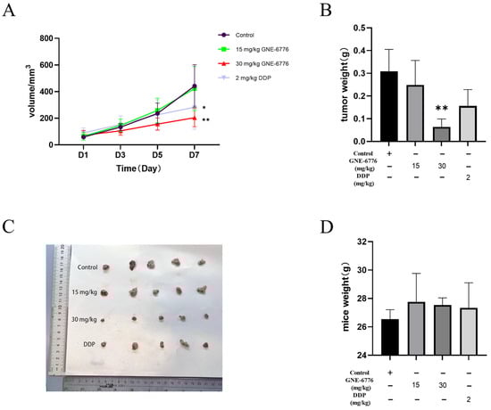 Effect of GNE-6776 on the Growth of Subcutaneously Implanted A549 Cell Tumors in Nude Mice. (A) Volumes, (B) weights, and (C) representative images of xenograft tumors excised from nude mice in each treatment group (vehicle control, low-dose GNE-6776 (15 mg/kg), high-dose GNE-6776 (30 mg/kg), DDP (2 mg/kg)) after 7 days along with (D) the corresponding body weights at the end of the treatment period. Data are presented as mean ± SD (n = 5). Statistical significance was analyzed using one-way ANOVA. * p < 0.05, ** p < 0.01, compared to the control group.