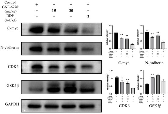 GNE-6776 regulates key signaling pathways in xenograft tumor tissue. Nude mice were treated with the vehicle control, GNE-6776 (15 and 30 mg/kg), or DDP, and a Western blot analysis of the protein levels in the tumor tissue was performed. Representative blots showed that the levels of an EMT marker (N-cadherin), cell proliferation marker (C-myc), and pivotal G1 phase marker (CDK6) decreased, and levels of a Wnt pathway-related marker (GSK3β) increased. GAPDH was used as a loading control. Data are expressed as mean ± SD (n = 4). Statistical significance was analyzed using one-way ANOVA. * p < 0.05, ** p < 0.01, compared to the control group.