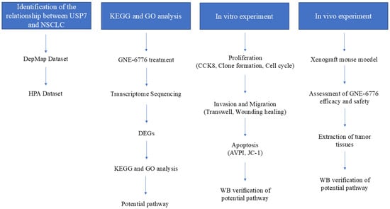 Illustration of the experimental procedure. This flowchart clearly presents an in-depth research process of GNE-6776 targeting NSCLC, aiming to comprehensively reveal the potential mechanism of action of GNE-6776 on NSCLC through a series of meticulously designed experiments and analyses. The entire research process is carefully divided into the following four core parts: “Identification of the relationship between USP7 and NSCLC”, “KEGG and GO analysis”, “In vitro experiment”, and “In vivo experiment”. Through the close connection and in-depth exploration of these four parts, this flowchart not only clearly demonstrates the research thread of GNE-6776’s impact on NSCLC but also highlights the core content and scientific value of the research.