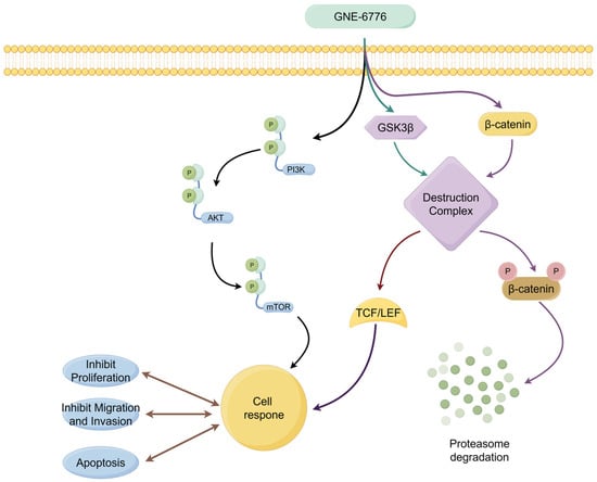 In NSCLC, the PI3K/AKT/mTOR pathway is closely related to tumorigenesis and disease progression [39,40]. It accelerates cell cycle progression, inhibits cell apoptosis, and promotes tumor cell migration. Studies have shown that PI3K/AKT/m-TOR pathway activation increases MMP2 and MMP9 protein levels, thereby enhancing the metastatic ability of cells [41]. GNE-6776 was found to significantly downregulate key phosphorylated proteins (p-AKT and p-mTOR), disrupting this oncogenic pathway. This inhibition likely accounts for the observed reduction in NSCLC cell proliferation and survival rates. Such findings align with the broader context of targeting hyperactivated PI3K/AKT/mTOR signaling in various cancers [42,43], emphasizing GNE-6776’s therapeutic specificity and efficacy. The Wnt signaling pathway is a highly conserved signaling pathway in evolution that controls cell growth, differentiation, apoptosis, and self-renewal. In tumor development, this pathway is often abnormally activated and has been linked to various cancers with high incidences [44]. Studies have shown that activation of the Wnt pathway can regulate tumor proliferation, migration, and invasion [45]. Our study found that GNE-6776 interfered with the Wnt/β-catenin signaling pathway. It enhanced GSK3β expression while promoting β-catenin phosphorylation, effectively suppressing its downstream oncogenic activity. This dual modulation of two critical pathways underscores GNE-6776’s capacity to address the multifactorial nature of NSCLC progression.