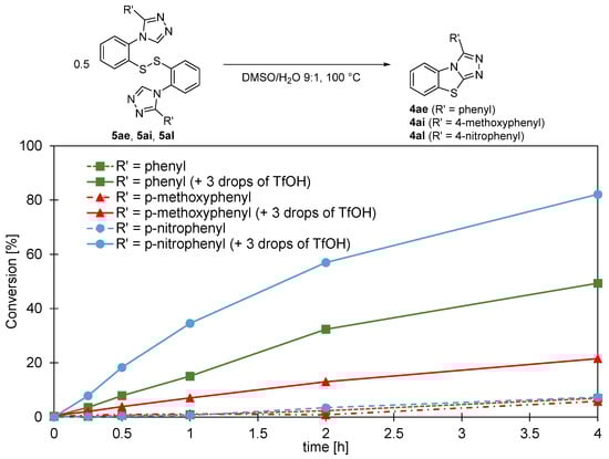 Interestingly, when the isolated disulfides were dissolved in a 9:1 DMSO/water mixture and heated in an oil bath at 100 °C, the formation of the corresponding benzo[4,5]thiazolo[2,3-c][1,2,4]triazole was observed to occur at a drastically lower rate, as seen in Figure 2 (dashed curves), compared to the one-pot reactions performed in two steps from the protected thiols, which were typically complete within 6 to 16 h. Since the main difference between the two sets of conditions was the presence of triflic acid from the thiol deprotection, we added three drops of triflic acid to the disulfides prior to heating and, indeed, the conversions observed by LCMS for the transformation of the disulfides to the benzo[4,5]thiazolo[2,3-c][1,2,4]triazole (Figure 2, solid lines) then matched the ones for the one-pot procedure. As can be seen in Figure 2, the rates of formation of the benzo[4,5]thiazolo[2,3-c][1,2,4]triazole from the disulfides showed a strong correlation with the π donor/π acceptor properties of the aryl substituent R′ on the triazole C3 of the disulfide: 5al containing the electron-withdrawing 4-nitrophenyl substituent shows over 80% conversion after 4 h which is a significantly higher rate than observed for 5ai containing the electron-donating 4-methoxypenyl group, for which only approximately 20% conversion was found after 4 h. These observations, together with the lability of the triazole C5-H (proven by the rapid H-D exchange when dissolved in deuterated methanol), suggest that the deprotonation of C5-H of the disulfide is likely to play a key role in the formation of the benzo[4,5]thiazolo[2,3-c][1,2,4]triazole scaffold.