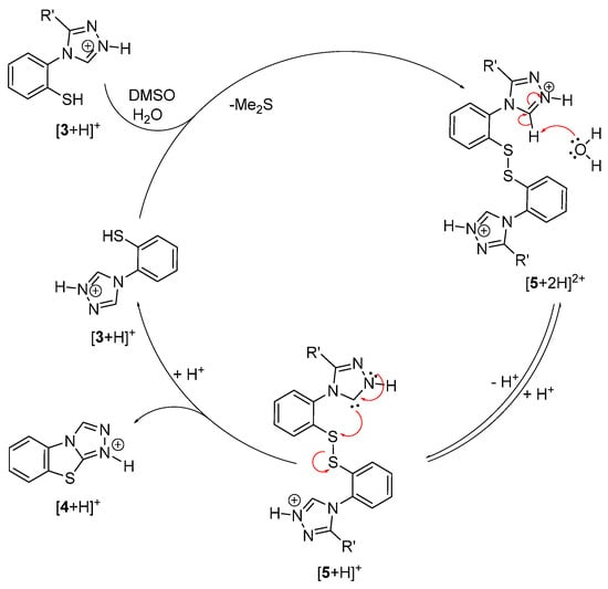 We have prepared C3,N4-substituted triazole derivatives 2aa–2ar (Scheme 3) and 2bp–2pr (Scheme 4) containing a N4-(2-((4-methoxybenzyl)thio)phenyl) group. Selective removal of the 4-methoxybenzyl substituent from the sulfur atom followed by oxidation with DMSO at 100 °C yields the C5-substituted tricyclic benzo[4,5]thiazolo[2,3-c][1,2,4]triazoles 4bp–4pr (Scheme 5). Detailed mechanistic investigations suggest that this oxidative cyclization reaction proceeds via an ionic pathway involving a disulfide intermediate which in the presence of a strong acid cyclizes to the corresponding tricyclic heteroarene (Scheme 6 and Scheme 7, Figure 2 and Figure 3).