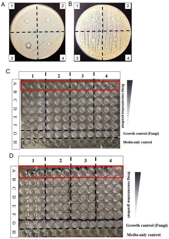 Disk diffusion assay and MICs of active compounds. Shown are 2if (1), 2ar (2), 4ah (3) and 2af (4), tested using a disk diffusion assay against C. albicans (A) and T. asah (B). MIC broth dilution against C. albicans (C) and T. asah (D) were tested with compounds 4ao (1) 4an (2) 4aq (3) 2an (4). Two-fold dilutions were made ranging from 256 µg/mL row A to 8 µg/mL row F; row G and H are fungal strains grown in media alone and media only control, respectively. All the compounds were tested in triplicates. Row A (in red) shows the inhibition of the fungi at the concentration of 256 µg/mL.