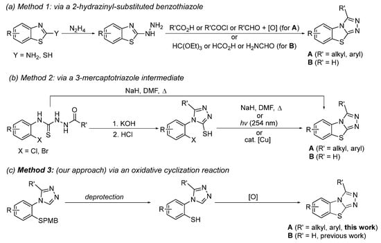 The preparation of compounds containing the benzo[4,5]thiazolo[2,3-c][1,2,4]triazole scaffold is generally carried out by one of the three pathways shown in Scheme 1. The first method starts with either a 2-amino- or a 2-mercaptobenzothiazole (Scheme 1a). Treatment with hydrazine leads to the 2-hydrazinyl derivative which is then reacted with an electrophilic reagent such as formic acid or an acid chloride to form the triazole ring in the last step [26,33,34,35]. The second approach proceeds via a 3-mercaptotriazole intermediate (Scheme 1b). Upon treatment with a strong base, the central thiazole ring is formed at elevated temperatures [36]. Alternatively, UV irradiation or the presence of a catalytic amount of copper(II) has been observed to allow this ring closure [37,38]. More recently, we have reported a third pathway beginning with a protected 2-mercaptophenyl substituted triazole which, upon deprotection of the thiol, undergoes cyclization under oxidative conditions to yield the desired benzo[4,5]thiazolo[2,3-c][1,2,4]triazole B (R = H) [39,40]. Our past research has demonstrated a high functional group tolerance for substituents on the phenyl ring. In our current work, we expand the substrate scope to benzo[4,5]thiazolol[2,3-c][1,2,4]triazoles containing substituents on the triazole ring (A, R′ ≠ H), as well as benzo[4,5]thiazolol[2,3-c][1,2,4]triazoles containing both substituents on the phenyl ring and on the triazole ring.