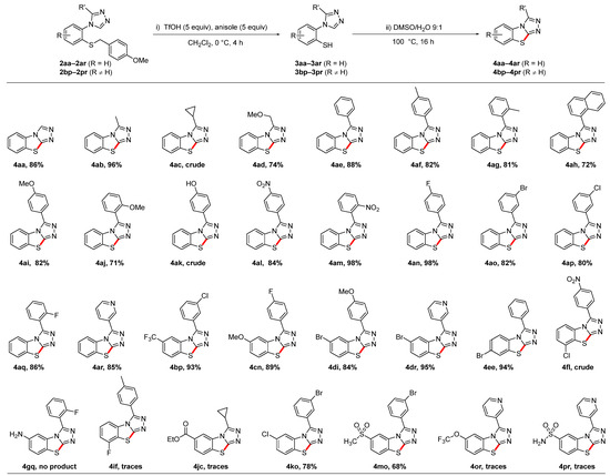 With the C3-substituted triazoles 2aa–2ar and 2bp–2pr in hand, we explored two-step synthesis of the tricyclic benzo[4,5]thiazolo[2,3-c][1,2,4]triazoles 4aa–4ar and 4bp–4pr by an oxidative cyclization reaction, as described in Scheme 1c. Compared to our previously reported procedure utilizing triazoles without C3 substituents [39,40], we found that both the deprotection step, as well as the subsequent cyclization, required prolonged reaction times (Scheme 5). The protected thiol of triazoles 2aa–2ar and 2bp–2pr was selectively deprotected with trifluoromethanesulfonic acid and anisole in dichloromethane under an argon atmosphere within 4 h yielding the free thiols 3aa–3ar and 3bp–3pr, as confirmed by LCMS. Upon completion of the deprotection, the reaction solvent was removed on a rotary evaporator, which yielded a red residue. It is worth noting that, contrary to the method reported previously by our group, we decided to employ dichloromethane as the deprotection solvent as it was easier to remove and did not corrode our pumps as the initial solvent (trifluoroacetic acid) did. By simply redissolving the red residue in a 9:1 DMSO/water mixture and heating in an oil bath at 100 °C overnight, a clean conversion to the corresponding C5-substituted benzo[4,5]thiazolo[2,3-c][1,2,4]triazoles 4aa–4ar was observed in all cases. Isolated yields for these tricyclic heteroarenes containing a wide range of aliphatic substituents, electron-donating and electron-withdrawing aryl groups or a pyridine functionality ranged from 71 to 98%. However, both the cyclopropyl substituted benzo[4,5]thiazolo[2,3-c][1,2,4]triazole 4ac and the phenol-substituted benzo[4,5]thiazolo[2,3-c][1,2,4]triazole 4ak could only be isolated in crude form. The synthesis of the C5-substituted benzo[4,5]thiazolo[2,3-c][1,2,4]triazoles 4bp–4pr, which also contained a range of substituents on the benzene ring of the tricyclic scaffold, was much less predictable. While in many cases, complete conversion was observed by LCMS and the tricyclic compound was isolated in excellent yields (examples: 4bp, 4cn, or 4dr), the amino-substituted benzo[4,5]thiazolo[2,3-c][1,2,4]triazole 4gq was not even detected by LCMS, and only traces were observed with the sulfonamide 4pr. Additionally, the ester 4jc was only detected in trace amounts, which was most likely due to the hydrolysis of the ester in the presence of acid and water. In the absence of water, excellent yields have been obtained in our group with related compounds [39].