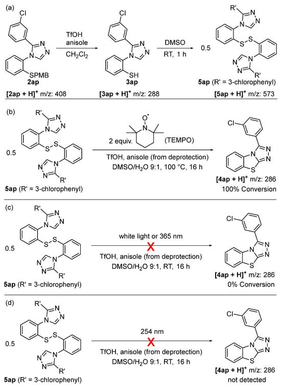 Mechanistic investigations and close monitoring by LCMS indicate that the oxidative cyclization step proceeds via a disulfide intermediate which requires thermal energy (i.e., heat) to convert to the benzo[4,5]thiazolo[2,3-c][1,2,4]triazole (Scheme 6). Indeed, subjecting triazole 2ap to our standard deprotection conditions yields the free thiol 3ap, which upon addition of DMSO and stirring at room temperature (instead of 100 °C), forms the disulfide 5ap as a sole product (Scheme 6a). The addition of two equivalents of TEMPO to the reaction mixture containing the disulfide 5ap, followed by heating to 100 °C overnight, led to clean conversion to the benzo[4,5]thiazolo[2,3-c][1,2,4]triazole 4ap without any TEMPO adducts being observed by LCMS, thus indicating that the cyclization step is unlikely to proceed via a radical mechanism (Scheme 6b). This is further supported by the fact that neither irradiation of the reaction mixture containing the disulfide 5ap with white light nor with UV light at 365 nm led to the formation of the benzo[4,5]thiazolo[2,3-c][1,2,4]triazole 4ap at room temperature (Scheme 6c). Furthermore, irradiation with UV light with a wavelength of 254 nm also failed to form the benzo[4,5]thiazolo[2,3-c][1,2,4]triazole 4ap, but instead led to a messy mixture of other compounds (Scheme 6d). Because the disulfide bond is expected to absorb UV light at 254 nm, thiyl radicals are likely to be present under these reaction conditions [48]. The fact that conditions that favor radical formation are not suitable for our heterocycle formation and fail to give any product, while resulting in a multitude of other compounds, strongly suggests that the cyclization step is thermally activated.