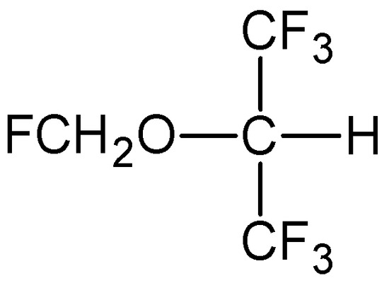 Sevoflurane (Figure 6) is a colorless, transparent, inexplosive liquid with a boiling point of 58.5 °C. It is one of the most commonly used volatile anesthetics, especially for outpatient anesthesia in all age groups as well as in veterinary medicine [80,81,82]. It does not have good solubility in blood and tissues, which causes the onset of anesthesia 1–1.5 min after the beginning of the inhalation of the drug and is followed by the rapid cessation of anesthesia. Together with desflurane, sevoflurane replaced isoflurane and halothane in modern anesthesiology. It is often administered in a mixture of nitrous oxide and oxygen [83]. It has a less potent narcotic effect than isoflurane. Its effect on spontaneous respiration and airway smooth muscles of the bronchial tree is the same as that of desflurane. Sevoflurane is an inhaled anesthetic that is used frequently to induce and maintain anesthesia in children during surgery.