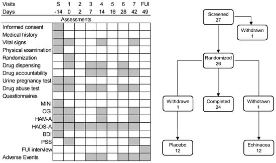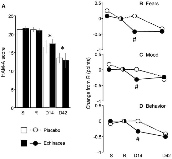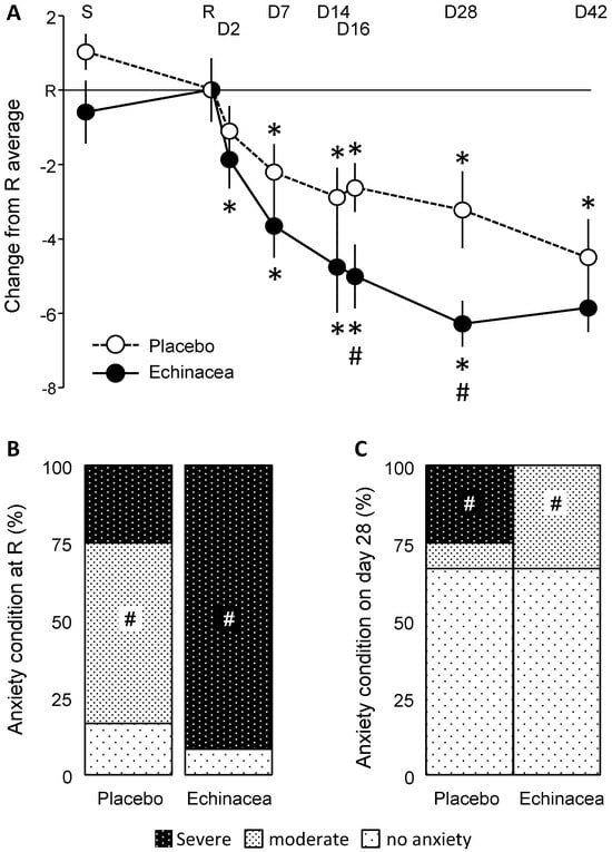 - Haller, J.; Krecsak, L.; Zámbori, J. Double-blind placebo controlled trial of the anxiolytic effects of a standardized Echinacea extract. Phytother. Res. 2019, 34, 660–668. [Google Scholar] [CrossRef] [PubMed]