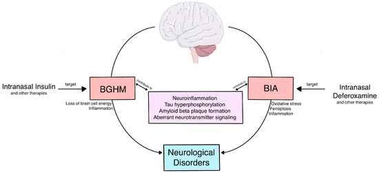 BGHM and BIA are promising therapeutic targets beyond their utility in monitoring disease progression or in contributing to distinguishing various CNS disorders based on brain biodistribution of the biomarkers. BGHM and BIA are observed across a large range of CNS disorders, and treatments targeting them have demonstrated therapeutic potential in preclinical studies and for intranasal insulin in clinical trials for AD and PD. With more experimental evidence and clinical trials demonstrating safety and efficacy, these treatments can also be repurposed to treat other CNS disorders that show BGHM and/or BIA.