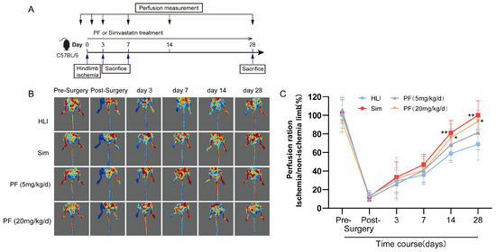 PF improved hindlimb ischemia in HLI mice. (A) The scheme of the experimental setup was presented. (B) Illustrative blood perfusion images at various time points (pre-surgery and post-surgery and 3, 7, 14, and 28 days following femoral artery removal) were shown for the four groups. Blue areas indicate regions with severe ischemia, red areas indicate regions without ischemia or with mild ischemia. (C) Blood perfusion was quantified at various time points. Data points are displayed as mean ± SD, n = 6. * p < 0.05, ** p < 0.01 vs. HLI.