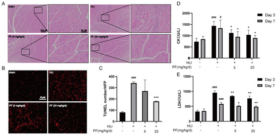 PF promoted the repair of ischemic gastrocnemius injury in an HLI mouse model. (A) H&E-stained muscle tissue in the hindlimb at 28 days after surgery were presented. The scale bar indicates 200 μm (left) and 50 μm (right). (B,C) TUNEL staining detected apoptosis (red) in the gastrocnemius at 7 days after surgery. The scale bar indicates 50 μm. The data points are represented as mean ± SD, n = 3. (D) Serum CK levels in mice were measured at 3 and 7 days after surgery. (E) Serum LDH levels in mice were measured at 3 and 7 days after surgery. The data points are represented as mean ± SD, n = 4. # p < 0.05, ### p < 0.001 vs. Sham; * p < 0.05, ** p < 0.01, *** p < 0.001 vs. HLI.