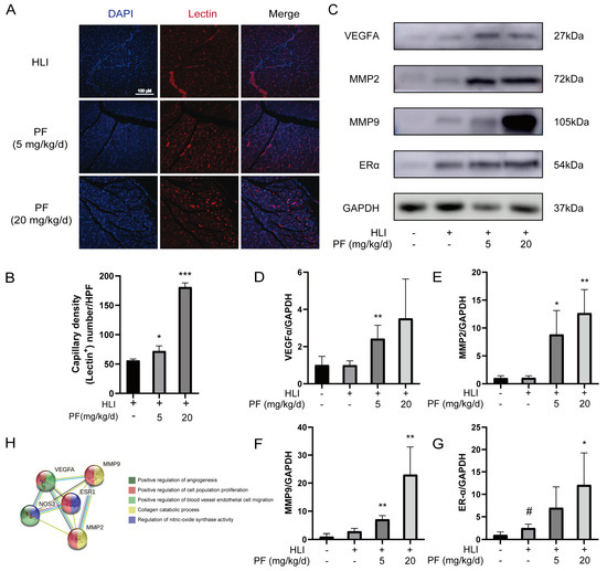 The increase in capillary density positively contributes to blood flow recovery in ischemic tissues [21,22]. The capillary density of mice was measured by lectin immunofluorescence staining at 28 days after operation. Positive lectin signals, representing capillaries, were notably higher in the PF group, suggesting a dramatic increase in capillary density in the gastrocnemius of HLI mice treated with PF (Figure 3A,B). In addition, Western blotting was used to measure angiogenesis-related proteins in mice ischemic gastrocnemius tissue. The results revealed that PF increased VEGFA, MMP2, MMP9, and ERα protein expression at 7 days post-HLI compared to the HLI group (Figure 3C–G). The STRING analysis demonstrated interactions among these proteins (Figure 3H), a higher number of connecting lines indicates a stronger interaction between the proteins. This study demonstrates that PF promotes angiogenesis, mitigates ischemic tissue injury, and enhances endothelial cell function by modulating the protein expression of VEGFA, MMP2, MMP9, and ERα, leading to increased capillary density in ischemic tissues.